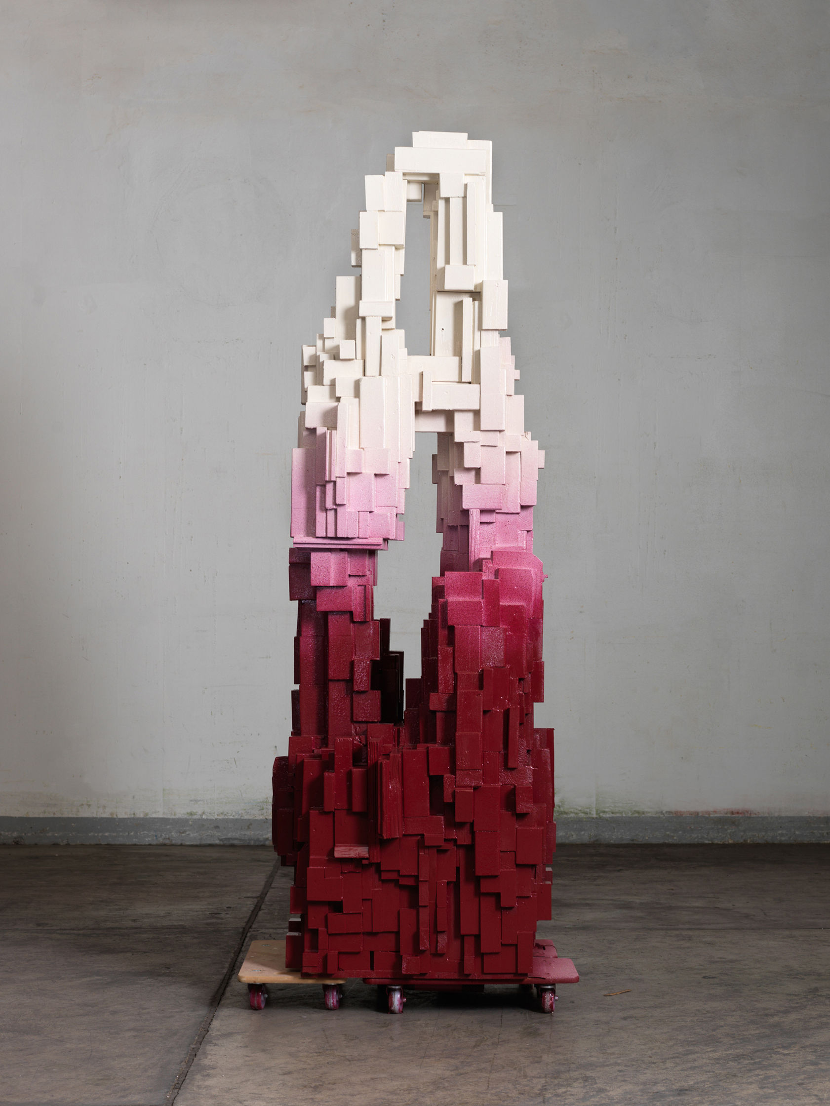 Guided by the unique properties of each discarded piece, Willner’s intuitive process transforms overlooked materials into works of art. Spray-painted in a custom ombre palette of deep burgundy fading into beige—colors designed in collaboration with the building’s architects—the sculptures are a testament to Willner’s ability to merge artistry, craftsmanship, and sustainability, reflecting Willner’s Craft Punk approach to contemporary design.